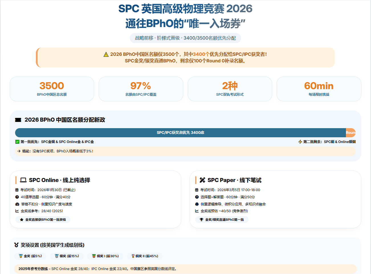当英国物理奥林匹克竞赛(BPhO)中国区名额从自由报名骤然收紧至3500个,当其中3400个席位明确优先分配给SPC及IPC获奖者——2026年的SPC(Senior Physics Challenge)英国高级物理竞赛已不再是“可选项”,而成为通往BPhO正赛的“必争之地”。