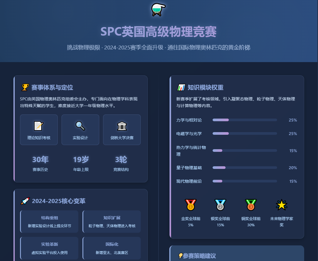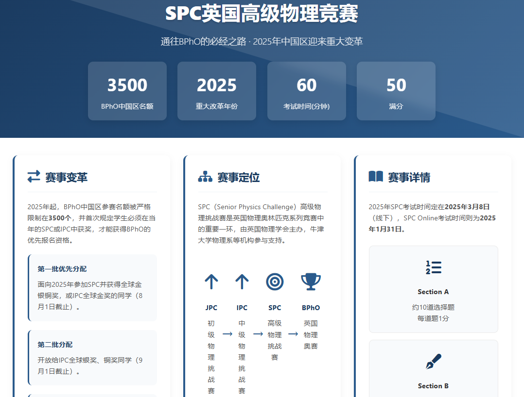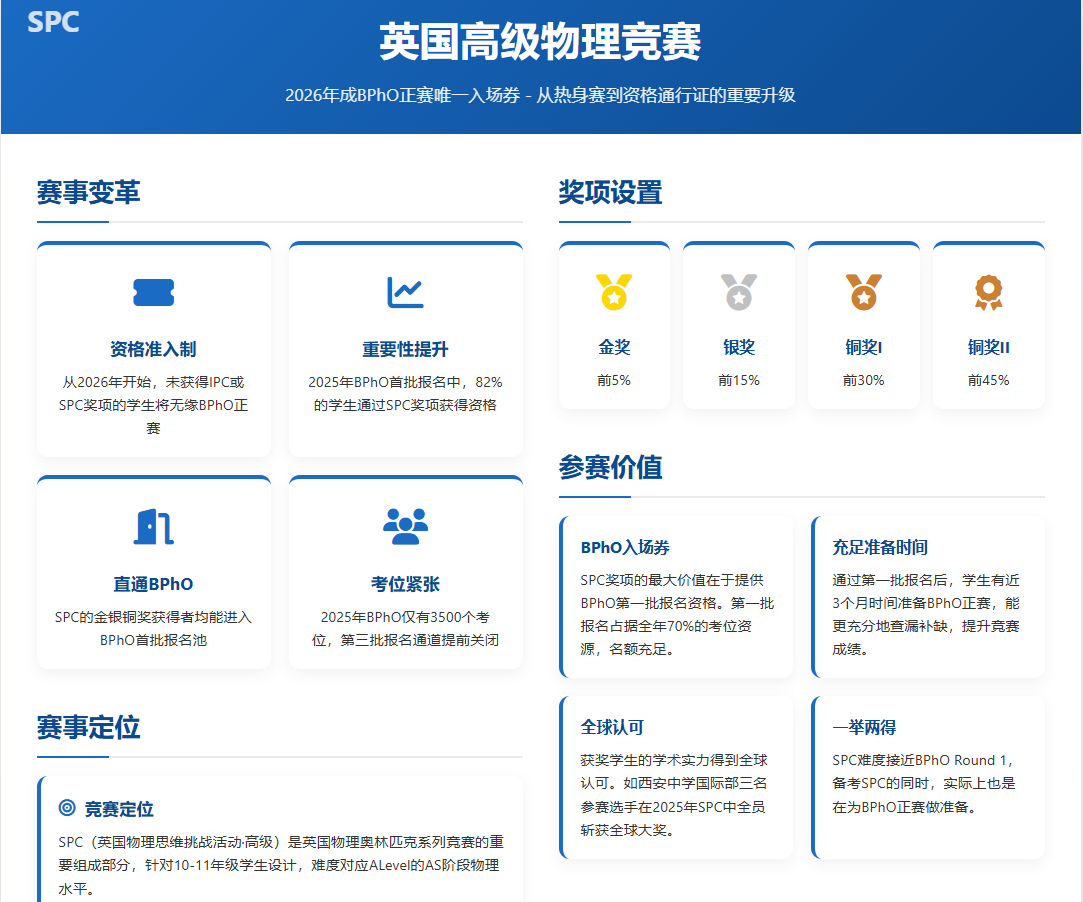 2025年10月,随着英国物理奥林匹克竞赛(BPhO)中国区第三批报名通道提前关闭,一个消息在物理竞赛圈迅速传开:从2026年开始,未获得IPC或SPC奖项的学生将无缘BPhO正赛。这一变化标志着物理竞赛正式迈入"资格准入制"时代,而SPC(英国物理思维挑战活动·高级)作为最重要的"入场券"之一,正成为高二学生必争之地。