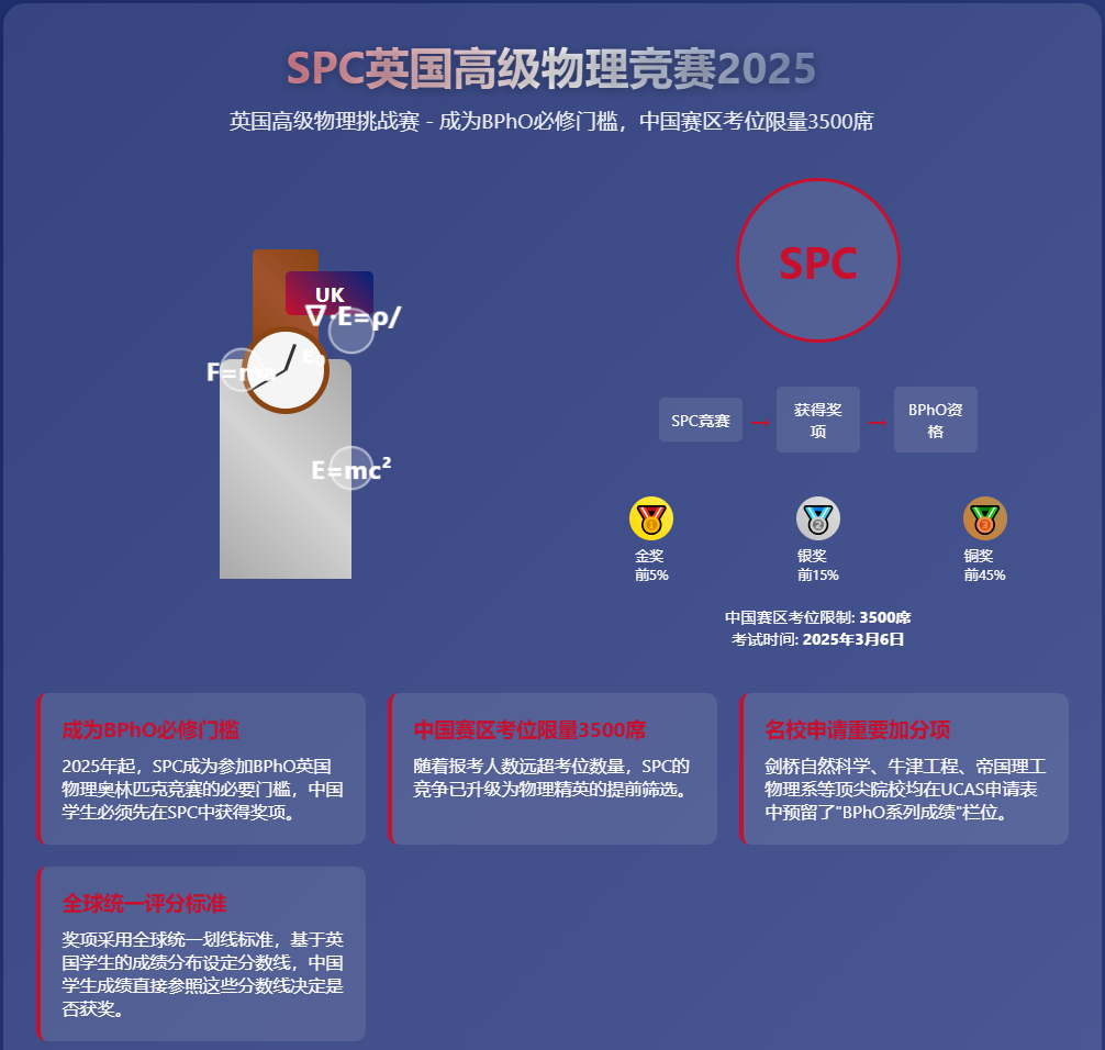 随着2025年BPhO参赛规则的变化,SPC英国高级物理挑战赛的重要性显著提升。SPC不再只是物理能力的证明,更是通往更高层次竞赛的钥匙。