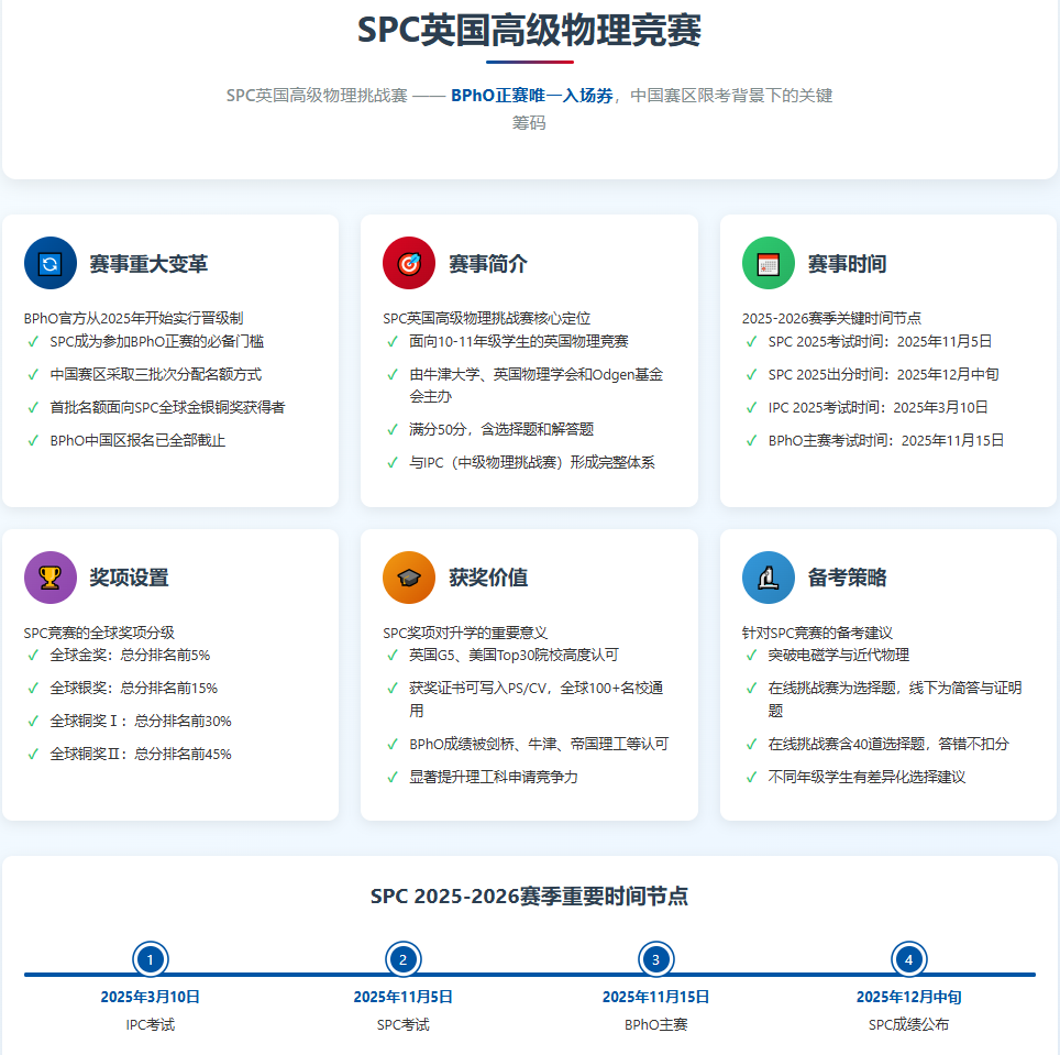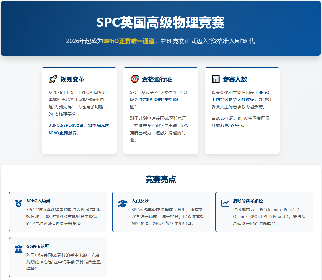 对于计划申请世界顶尖大学理工科专业的学生而言,SPC已不再是可选项,而是必选项。在BPhO限制考位的新规下,SPC奖项已成为通往顶级物理竞赛的唯一通行证。